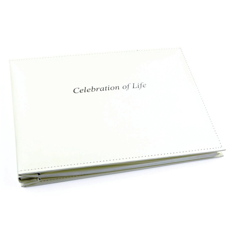 - The cover of the Celebration of Life Condolence Book is made from high-quality white material, boasting a hardback padded design with a subtle grain. Measuring 265 x 195mm, this book provides ample space for heartfelt messages and condolences.