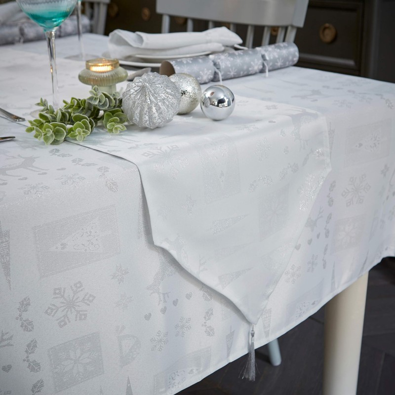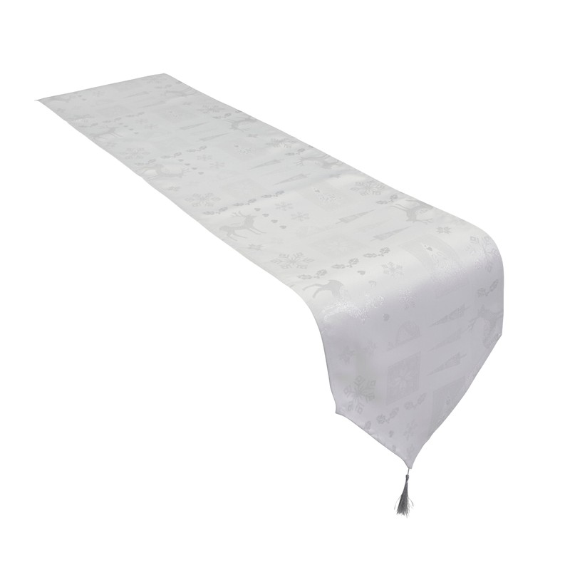 Celebright Christmas Tasselled Table Runner - 13 x 72 Inches (33 x 183 cm) - Ideal Xmas Dinner Table Decorative Settings - Metallic Christmas Theme Embossed Design - White& Metallic Silver