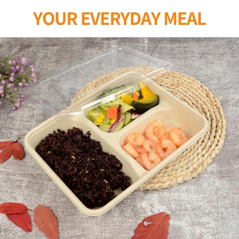 Celel 3 Compartment Paper Bowls with Lids, Disposable Bento Box with Lid Divided Disposable Lunch Tray for Restaurant, Food Court - 50 Bowls 50 Lids