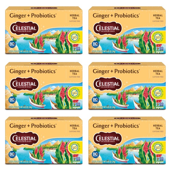 Celestial Seasonings Ginger + Probiotics Herbal Tea, Caffeine Free, 16 Tea Bags Box (Pack of 6)