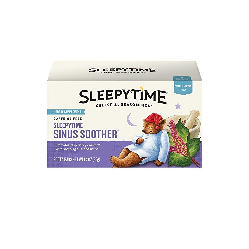 Celestial Seasonings Sleepytime Sinus Soother Tea is designed to promote respiratory comfort* with a blend of tulsi and stinging nettle. Our caffeine and gluten-free tea is also infused with chamomile and mint for a cool, herbal taste. We achieve this flavor profile without the use of any artificial flavors, colors or artificial preservatives. Simply steep an herbal tea bag in hot water for 4-6 minutes for the perfect cup. Includes one 20-count box of Celestial Seasonings Sleepytime Sinus Soother Tea. Celestial Seasonings teas are an invitation to bring the perfect balance to your day. From herbal teas to chai and matcha lattes and everything in between, there’s a Celestial blend that’s just right for any occasion. We blend our teas using the finest herbs, teas, spices and botanicals available, and we lovingly package them in engaging, thoughtful boxes that truly represent the goodness found inside. *These statements have not been evaluated by the Food and Drug Administration. This product is not intended to diagnose, treat, cure or prevent any disease.
