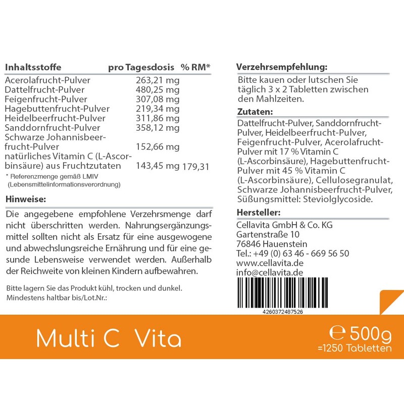 CELLAVITA Multi C Vita 1250 Tabletten | Natürliches Vitamin C | Kautabletten/Lutschtabletten mit natürlichem Vitamin C aus der Acerolakirsche | ohne synthetische Zusätze im Vorratsbeutel