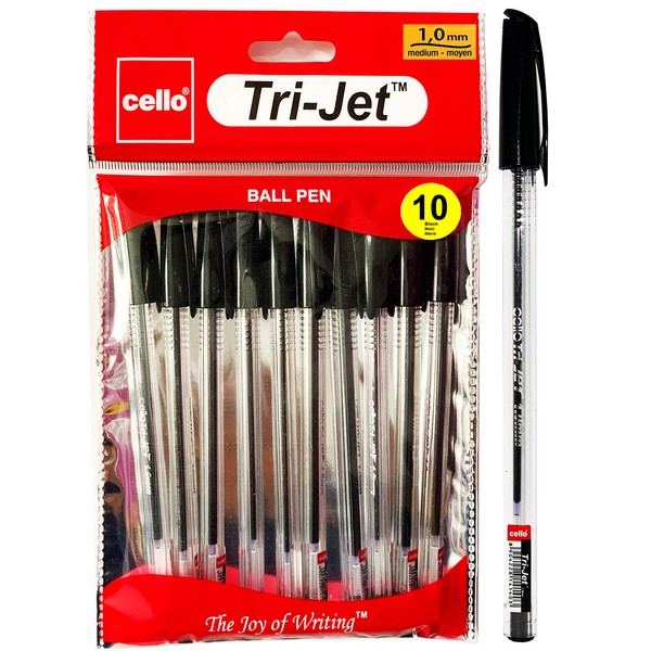Cello Tri-Jet Ballpoint Pens Extra Grip Medium Point Biros (1.0 mm) - Black Pens, Pack Of 10