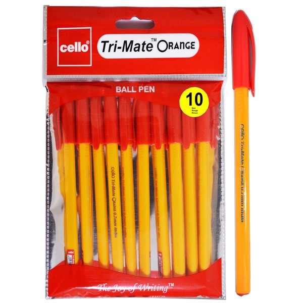 Cello Tri-Mate Orange Ballpoint Pens Medium Point Biro (Red, Pack of 10)