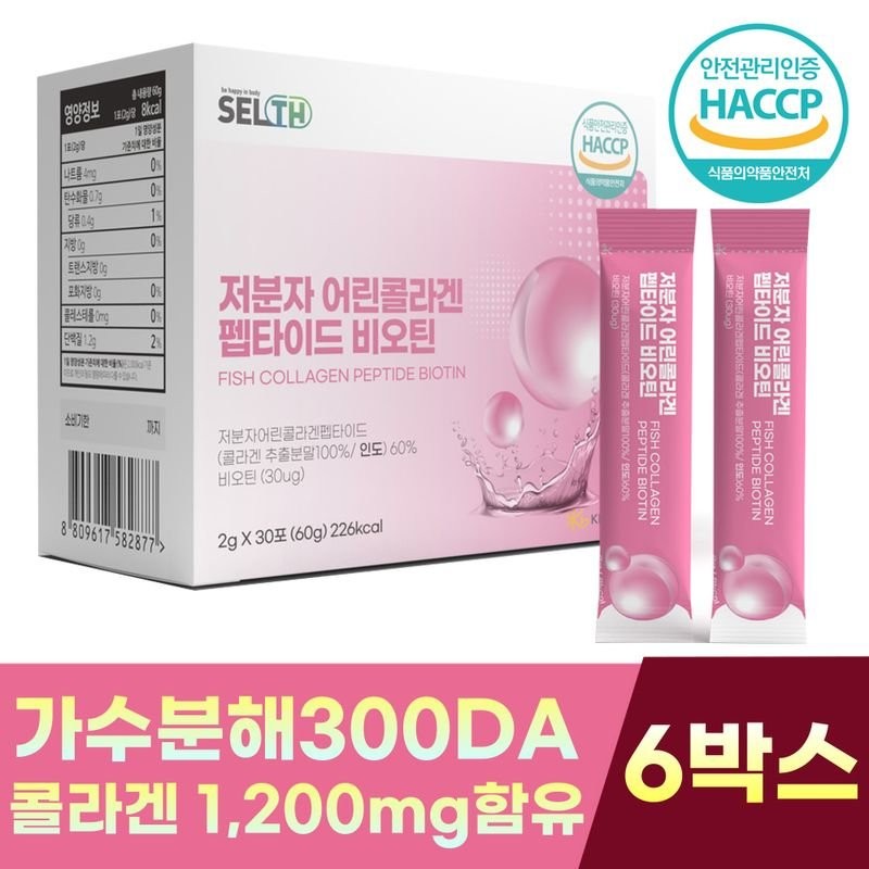 Cells Low Molecular Young Collagen Peptide 300 Dalton Biotin 2g / 셀스 저분자 어린 콜라겐 펩타이드 300달톤 비오틴 2g X 30스틱 6박스, 단일옵션