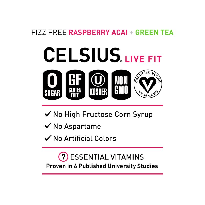CELSIUS. Live Fit. A uniquely blended formula with healthy energy and key vitamins make CELSIUS an ideal pre-workout drink. It’s low in sodium and contains zero sugar, no aspartame, and no artificial flavors, colors, or preservatives. CELSIUS energy drinks are also Certified Vegan, Kosher, and non-GMO. Its proprietary formula contains green tea extract and EGCG. It also includes guarana seed extract, ginger root for flavor and digestion, vitamin C to support your immune system, vitamin B for energy production, and chromium to help control hunger. Boost your energy while enjoying the refreshing flavors of CELSIUS Raspberry Acai Green Tea Non-Carbonated Fitness Drink! It has the perfect balance of flavor and energy that serves as an awesome pick- me-up for active lifestyles. CELSIUS is available in 12 oz. slim cans and sold in a 12-pack for convenience.