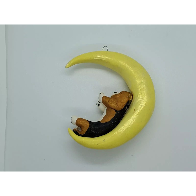 Celtic Forest Clay BASSET HOUND Ornament SLEEPING ON CRESCENT MOON Window Hanger TRI CLR Handmade