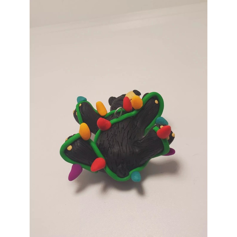 Celtic Forest Clay BLACK BEAR Christmas Ornament TANGLED IN LIGHTS Polymer Clay HAND MADE OOAK