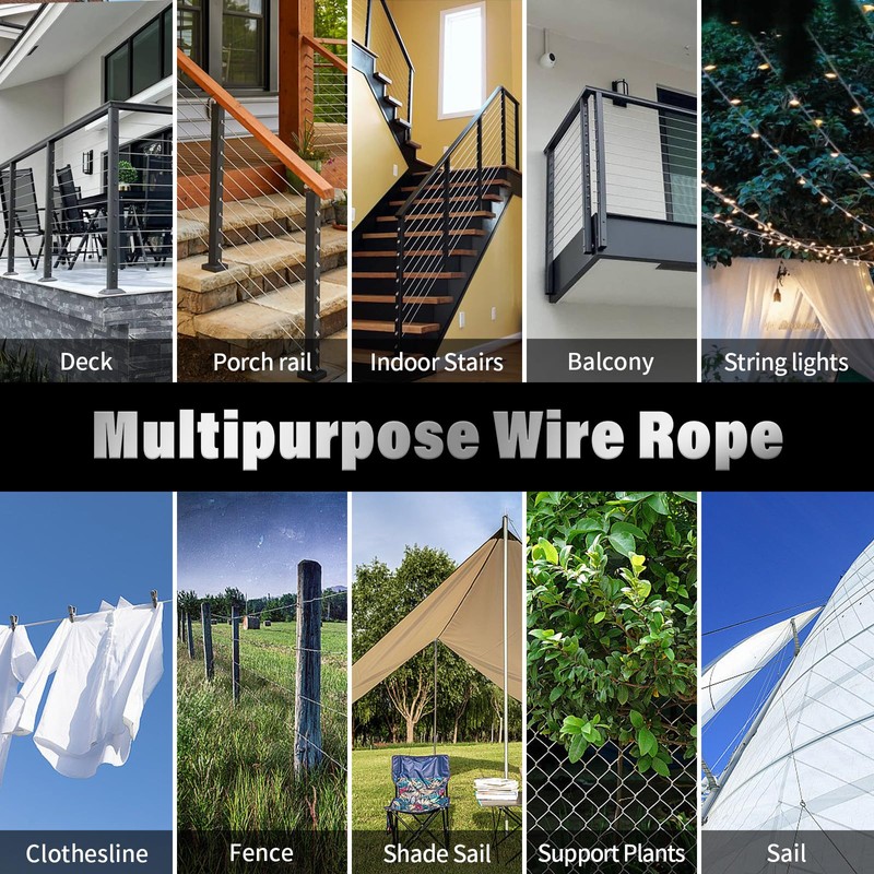 - Multipurpose Wire Rope: Our 1/8 stainless steel cable is your versatile solution for a multitude of applications. Ideal for deck cable railing hardware handrail systems, also can use for zip line, aircraft cable, garden fencing, hanging string lights, hanging pictures, clothesline, shade sails, plants vines trellis, and other DIY projects in your garage, patio, garden, yard, backyard.