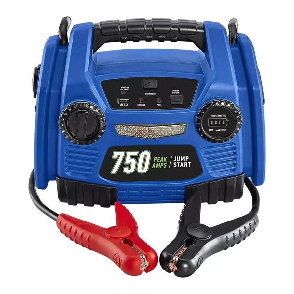 This 750A (battery peak) peak amp jump starter delivers enough power to start up small passenger cars and power-sport vehicles. The jump starter features a high-performance 9 Ah sealed lead-acid battery that delivers up to five jump starts on a single charge. Includes 25 in. heavy duty 6 AWG jumper cable, built-in super bright 3 LED work light and easy-to-read LED battery status indicator.