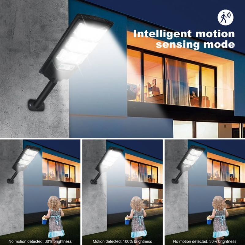 - ☀️Intelligent Mode: Intelligent motion sensing mode: The light usually maintains 30% brightness at night, automatically turns to 100% brightness when an object is detected approaching, and then turns back to 30% brightness after leaving. You can also use the remote control to control the on/off of the solar lights, adjust the brightness by 25%/50%/75%/100%, and set the timer for 2/3/5/6/8H.