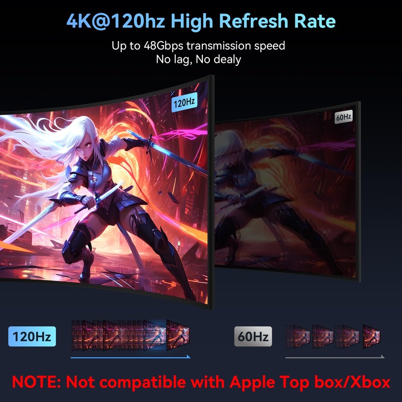 - High speed video bandwidthData rate up to 48Gbps (FRL 12Gbps/4 Lane), which ensures high-quality transmission of pictures and sound quality.Support HDR (HDR10/HDR10+/HLG/Dolby Atmos) , VRR, FreeSync, G-Sync, 3D effect.