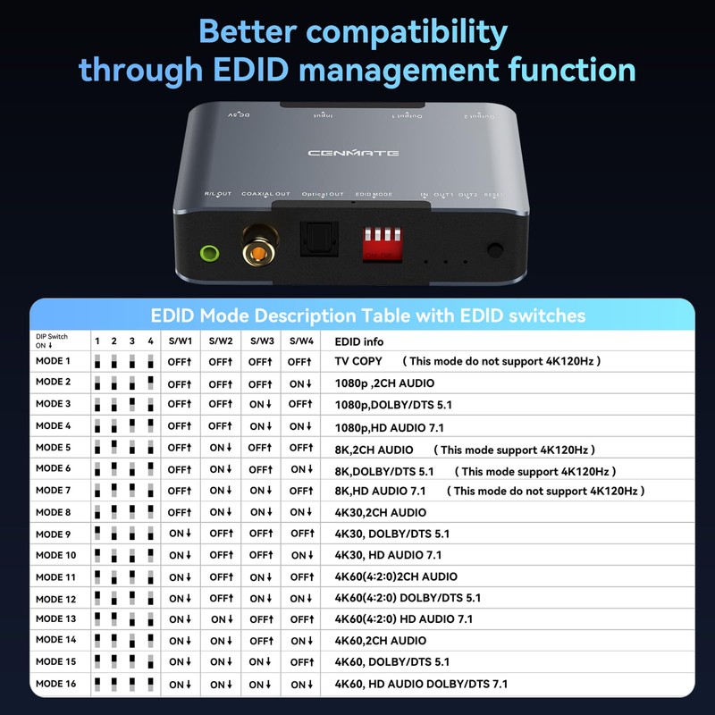 - EDID ManagementAdopts 4-position EDID toggle switch, 16 kinds of EDID methods. There are multiple modes to choose from. (Please see the pictures and manual for multiple modes) The HDMI splitter's adaptive EDID management intelligently optimizes output to ensure compatibility and the best display settings across different screens.