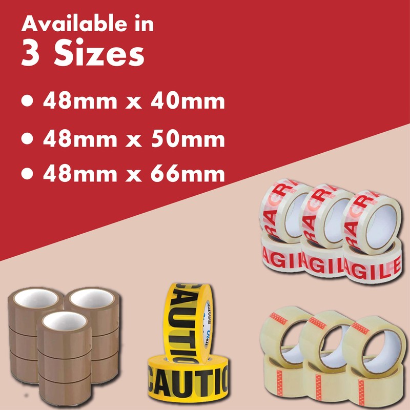 - Extra Strong Brown, Clear, Fragile and Caution Packing Tape: Ideal for sealing parcels, boxes, and carton warehouse use. Available in various sizes: 48x40, 48x50, and 48x66, this super resistant tape is a must-have for any moving house essentials package.