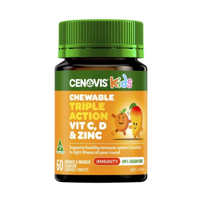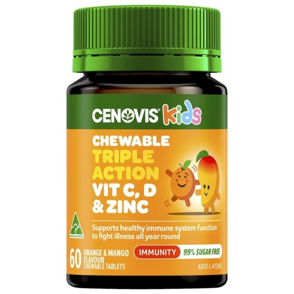 Support your healthy immune system function to fight illness all year round with Cenovis® Kids Chewable Triple Action Vit C, D & Zinc. Enjoy the great tasting, Orange & Mango flavoured chewable tablets that are 99% sugar free.