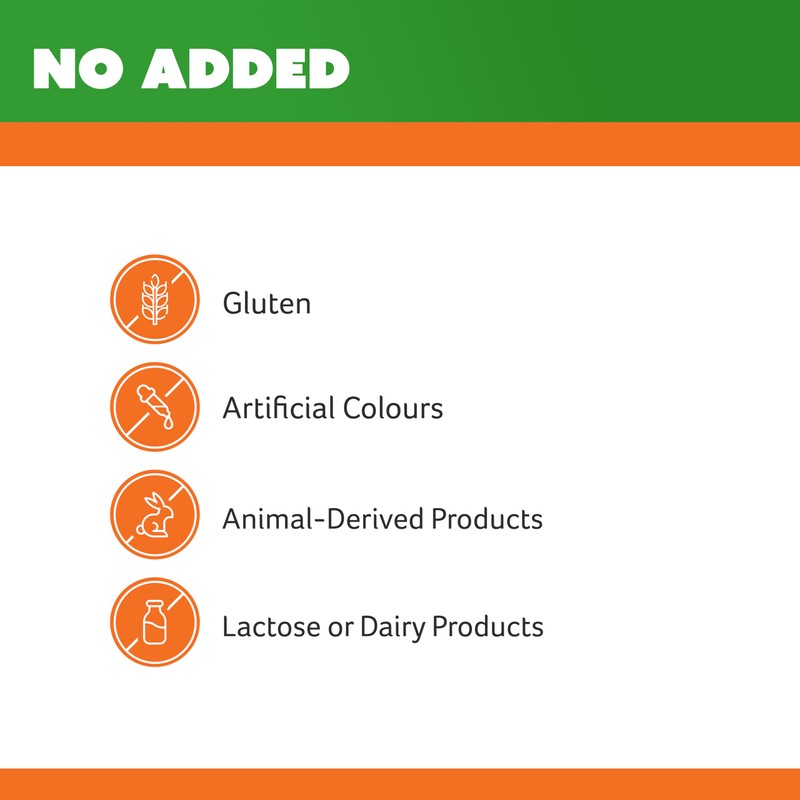 - NO ADDED: Gluten, lactose, artificial colours, dairy products, or animal-derived products*