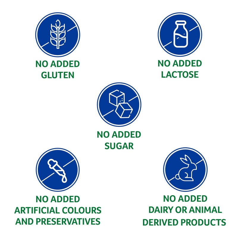 - NO ADDED: Gluten, lactose, sugar, artificial colours or flavours, artificial sweeteners, dairy products or animal-derived products