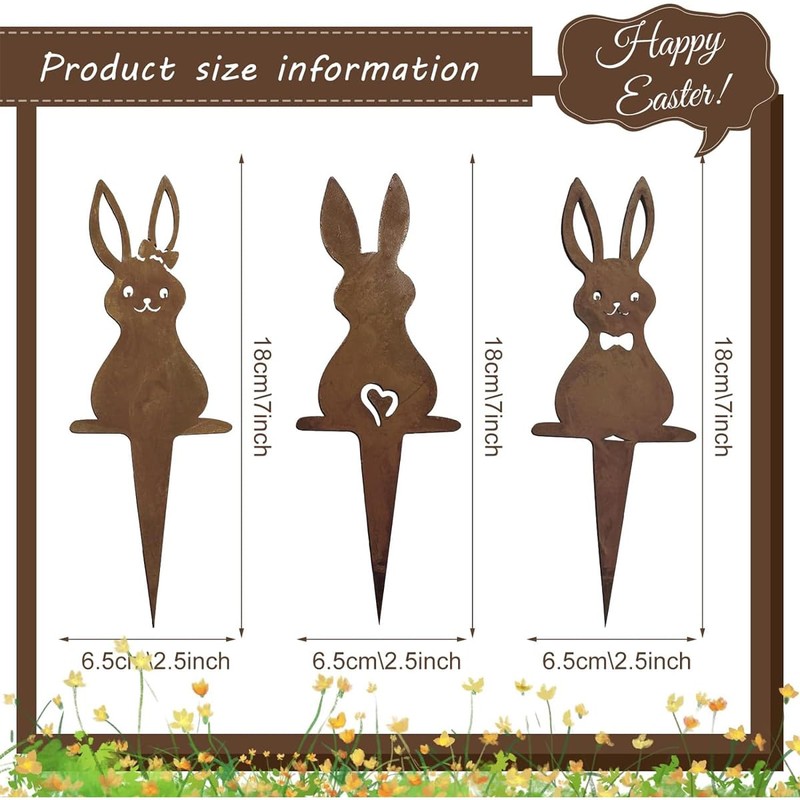 - Crafted from high-quality metal, our Easter decoration garden stakes are built to last. The expert craftsmanship ensures their durability, allowing you to enjoy their beauty year after year. The sturdy metal construction also adds stability, ensuring that these bunnies will withstand outdoor elements.