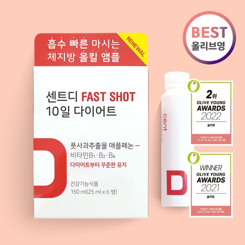 Accumulated sales of 21,000,000 bottles. Cent D recorded no.1 sales in Olive Young and NAVER. Won the Olive Young Awards for two consecutive years, no. 1 ranked brand in Naver Shopping, and has 58,000 reviews with rating of 4.7 out of 5. Cent D is an ampoule selected by numerous influencers and celebrities. Drinking type ampoule for quick absorption. Customer reviews include they became able to wear whatever they want, it is easy to consume, and it reduces body fat although it is tasty. Health functional product for body fat loss. Enriched with certified functional ingredients to help with reducing body fat. From the clinical test result of applephenon, which is a function ingredient extracted from green apples, it was shown that weight, waist measurement BMI, hip measurement, visceral fat of belly, and total belly fat were reduced while the amount of adiponection was increased. Fills in insufficient nutrition and helps with nutrient metabolism. Certified as vegan product in Korea. The liquid type product helps with effective and quick absorption. Start tasty diet with fresh and sweet apple flavor. Keep your body fit while drinking. Diet ampoule liquid for quick absorption.   Ampoule for daily distinguishing weight loss. Tasty diet supplement that can be easily and conveniently consumed.