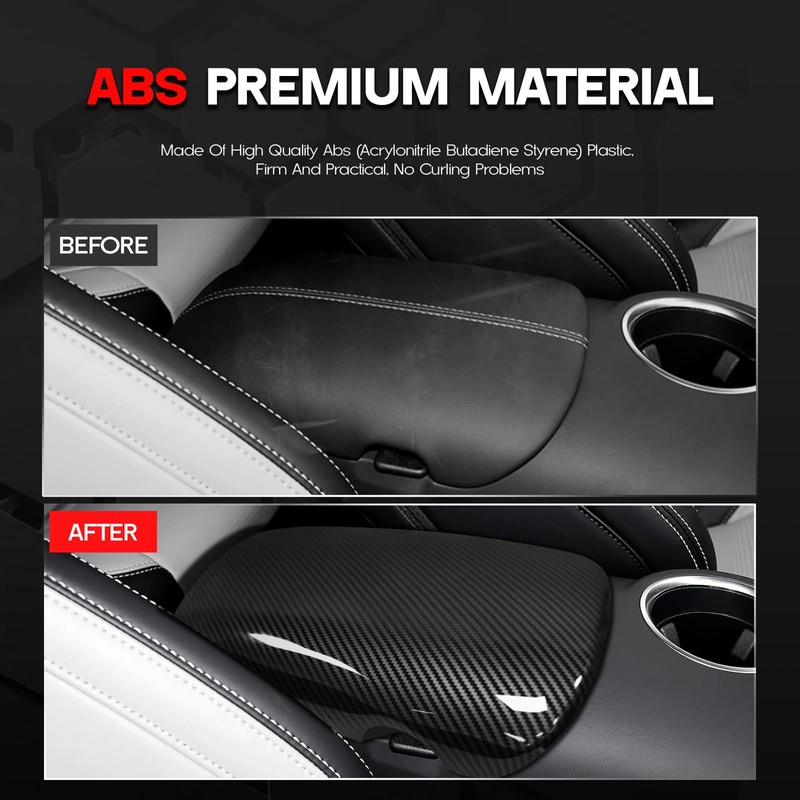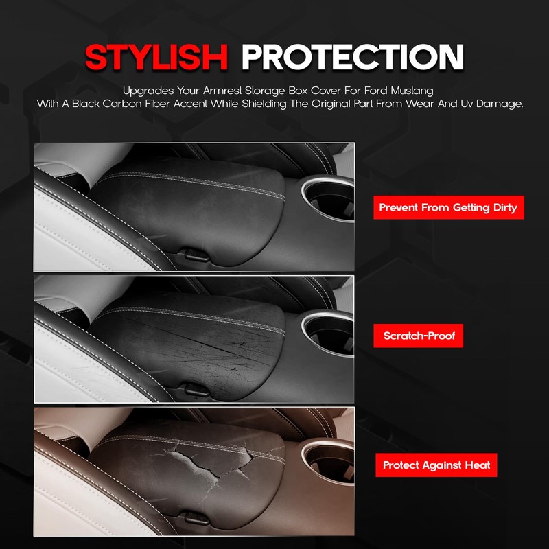 - 【PREMIUM RED ABS MATERIAL】 – High-quality ABS plastic with a carbon fiber painting, offering durability and scratch protection for your Ford Mustang armrest box cover.