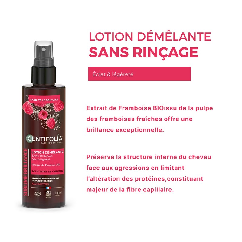 CENTIFOLIA | Entwirrungslotion ohne Ausspülen | Entwirrt ohne das Haar zu beschweren | Serie Sublime Glanz | glänzendes & geschmeidiges Haar | Bio Himbeeressig | 99% natürlich | 2 x 200 ml
