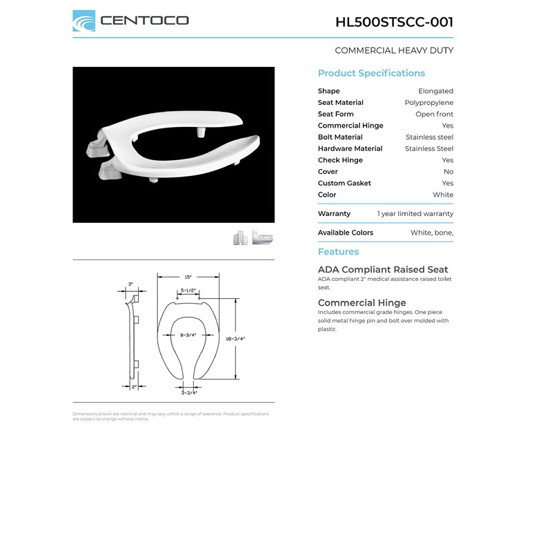 Centoco HL500STSCC-001 Heavy Duty Plastic ADA Compliant 2" Lift Elongated Raised Toilet Seat, Open Front without Cover, White