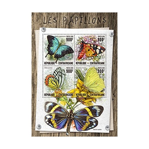 Country: Central Africa, Year of Issue: 2016, Type: 4 Stamp Sheet, Topic: Butterflies, Sea Green Swallowtail, Cream-spot Tiger, Common Jezebel, Brimstone