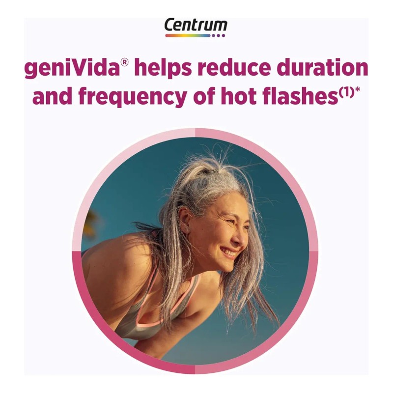 Hazte cargo de tu viaje de menopausia con los suplementos dietéticos Centrum Menopause Support, especialmente diseñados para ayudar a aliviar los síntomas perjudiciales de la menopausia. Fabricado con geniVida clínicamente estudiado, este multivitamínico diario de apoyo a la menopausia ayuda a minimizar la frecuencia y duración de los sofocos (1). geniVida, una forma sintética de genisteína, imita el papel del estrógeno en el cuerpo para reducir la frecuencia y la duración de los sofocos. Este multivitamínico para mujeres incluye un complejo de vitamina B de alta potencia para ayudar a apoyar la función cerebral normal, el metabolismo y la energía celular. También proporciona calcio, vitamina D y magnesio para ayudar a mantener la densidad ósea y apoyar la fuerza ósea. Además, el zinc, el cobre y el manganeso apoyan la producción de colágeno para ayudar con la flexibilidad ósea. Con biotina y vitaminas A, C y E. * (1) geniVida es una marca comercial de DSM. Un estudio clínico mostró una reducción significativa de los sofocos después de 12 semanas de uso diario de geniVida.