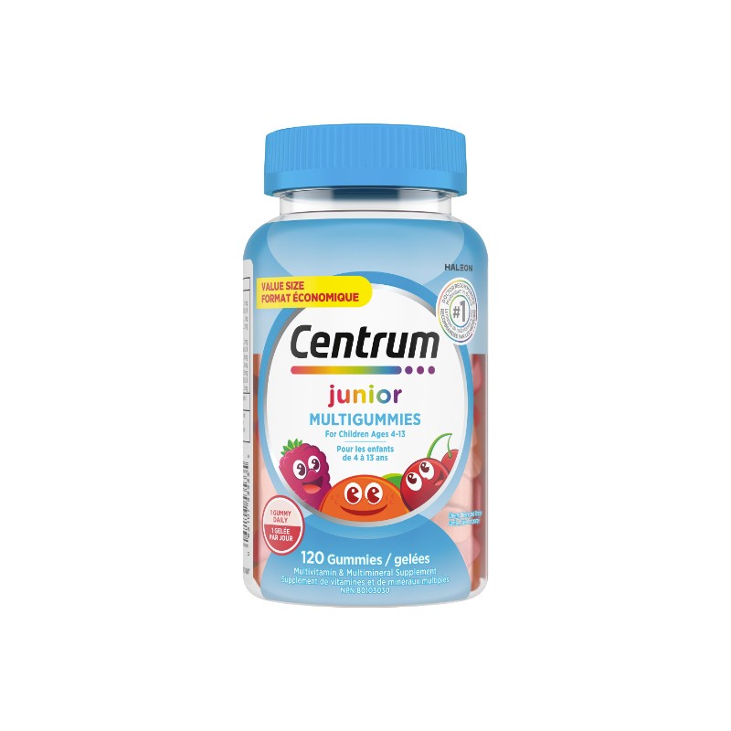 Formulated to help address the nutritional gaps of children 4-13 years old, Centrum Junior MultiGummies come in cherry, berry, and orange flavours that kids will enjoy. Centrum Junior MultiGummies help support the immune system, maintain bone health, dental health, and eyesight, and provides antioxidants to protect cells from free radical damage with just one gummy a day. A delicious way to get essential micronutrients from A to Zinc, Centrum Junior MultiGummies helps nourish your child’s body at the cellular level and supports good health. Backed by over 35 years of nutrition science expertise, Centrum is the #1 doctor recommended multivitamin brand* and the #1 selling multivitamin brand in Canada.** This package includes one 120-count bottle of Centrum Junior MultiGummies. (*Based on IMS Health Data dated March 2020; **Centrum calculation based in part on data reported by Nielsen through its Market Track Service for the Adult Vitamins Category for the 52-week period ending 10/31/2020)