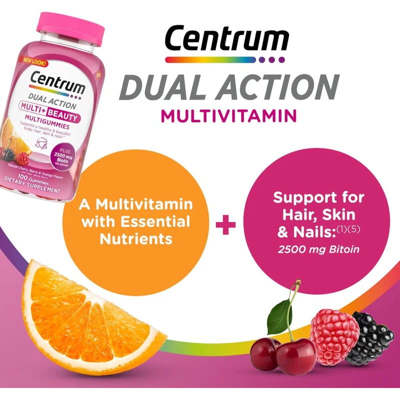 - Una botella de 100 unidades de gomitas multivitamínico Centrum Multi+ Beauty con sabor a cereza, bayas y naranja Multivitamínico diario que apoya una apariencia saludable (1) incluyendo biotina adicional para el cabello, la piel y las uñas, apoya huesos fuertes (2), ayuda a apoyar sus necesidades diarias de energía (3) y apoya la función inmune normal (4)(5) Multivitaminas con vitaminas B, vitamina D, calcio y antioxidantes (5) Gomitas con una combinación de vitaminas A, C, E y biotina para apoyar el cabello, la piel y las uñas saludables (1, 5) Vitaminas gomosas fáciles de tomar hechas con ingredientes sin gluten y sin sabores artificiales ni edulcorantes Multivitaminas en gomitas para adultos disponibles en tres sabores naturales de gran sabor: cereza, baya y naranja Disfruta de todos los beneficios de estas gomitas multivitamínicas tomando dos gomitas diarias Aviso legal