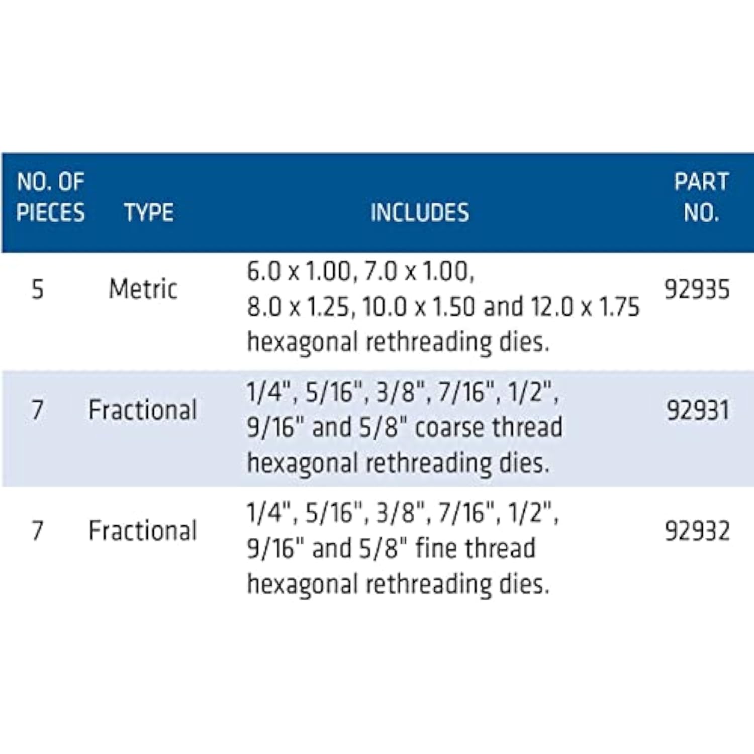 - 5 piece Metric rethreading set includes 6.0 x 1.00 7.0 x 1.00 8.0 x 1.25 10.0 x 1.50 and 12.0 x 1.75