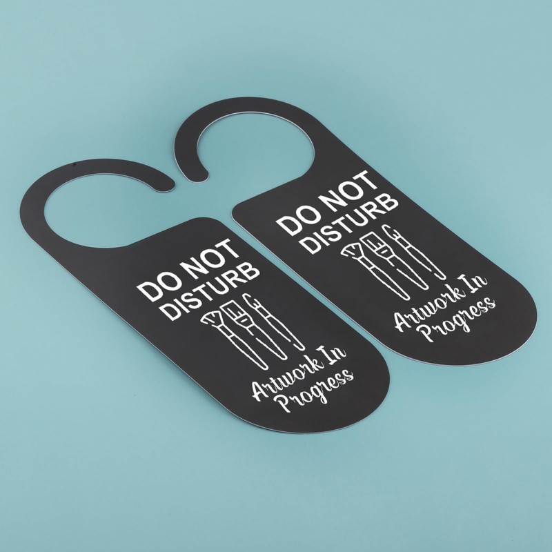 - The words on the door hanger reads: Do Not Disturb Artwork in Progress.