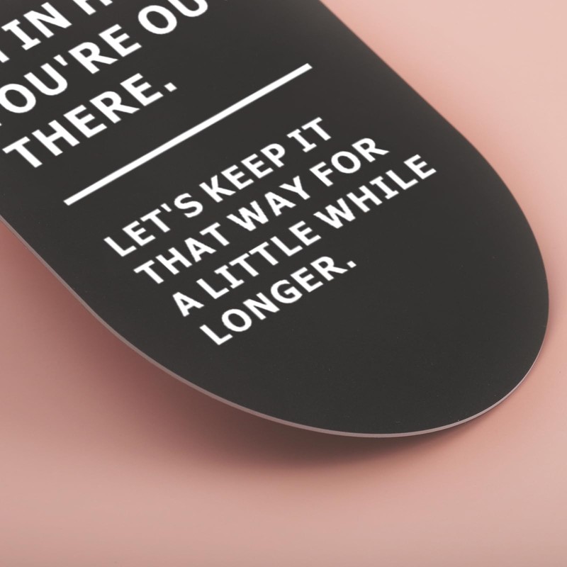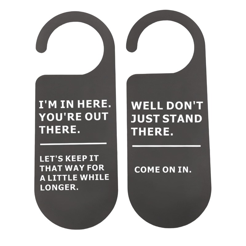 - The verbiage on the door hanger reads: Front side - I'M IN HERE. YOU'RE OUT THERE. LET'S KEEP IT THAT WAY FOR A LITTLE WHILE LONGER, Back side - WELL DON'T JUST STAND THERE. COME ON IN.