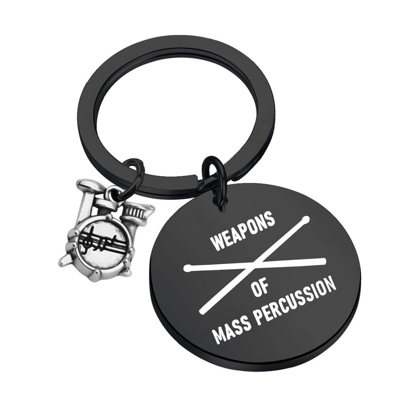- Engraved with the sentence " Weapons of mass percussion ". We only stamp on one side of the keychains!