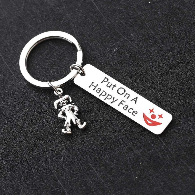 - A cynical gift, "Put on a happy face" keychain of Arthur Fleck as the Joker, from the 2019 film Joker.