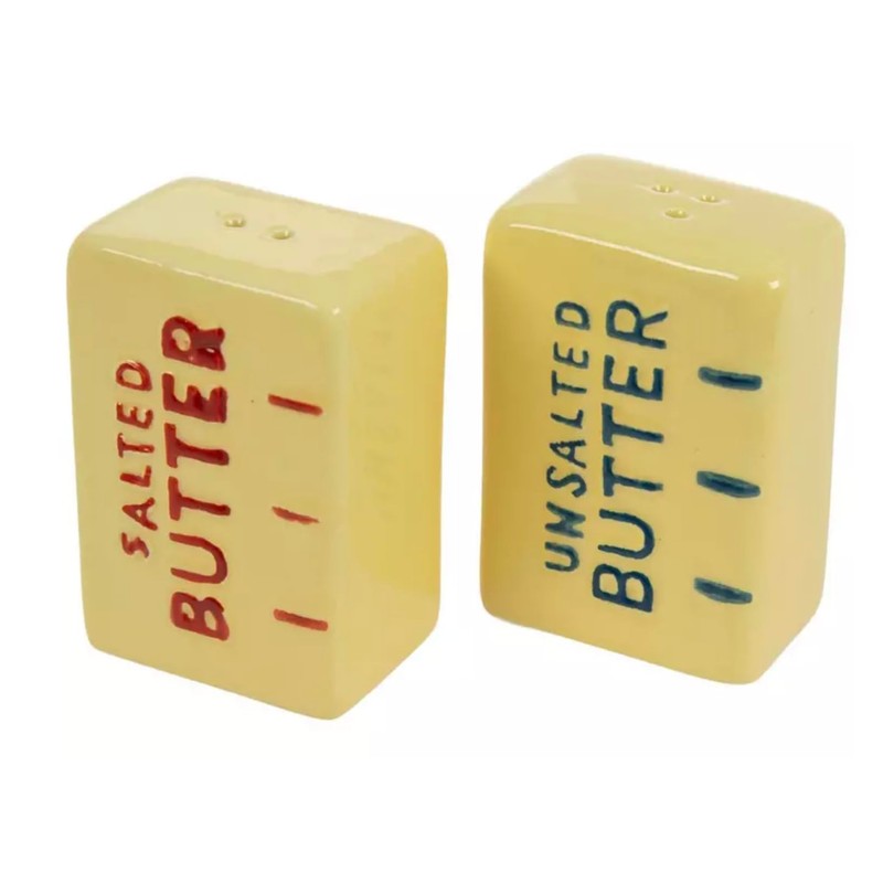 • DESIGN: Charming butter stick shaped ceramic salt and pepper shaker set adds a whimsical touch to your dining table or kitchen counter