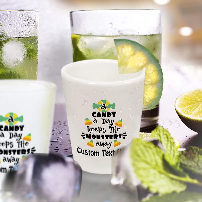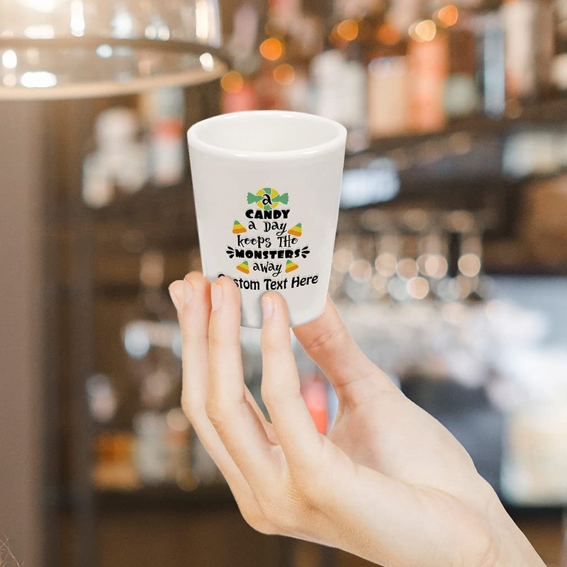 Ceramic Custom Halloween Shot Glasses Candy A Day Keeps The Monsters Away Multi Colour Holidays and Occasions Bar Supplies Accessories Personalized Text Here 2 Oz