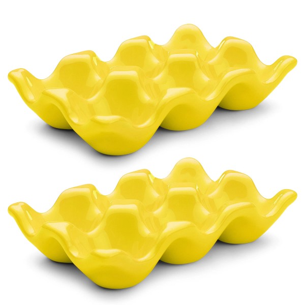 Ceramic Egg Tray 6-Cup Egg Holder Container for Fridge (Yellow, 2 Pack)