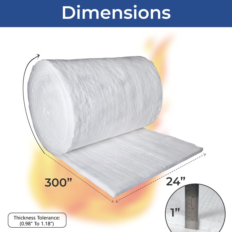 - FIREPROOF INSULATION: This ceramic fiber insulation blanket is high heat resistant & fireproof blanket, rated up to temperature of 2400F (1315C), and measures 1 inch x 24 inches x 300 inches (25 ft) in size