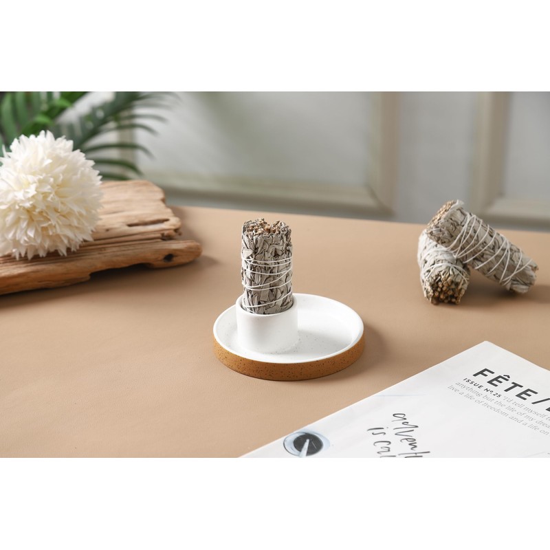 - 【Safe and balanced】-The white sage holder burner holds different size white sage or palo santo and incense sticks. The diameter of the cylinder on its holder is 1.6 inch, it will hold most standard sized white sage bundle or palo santo sticks and preferably 4-6in long. The center holder was tilted somehow to hold the white sage or palo santo sticks at an angle, and allows them to burn safely.