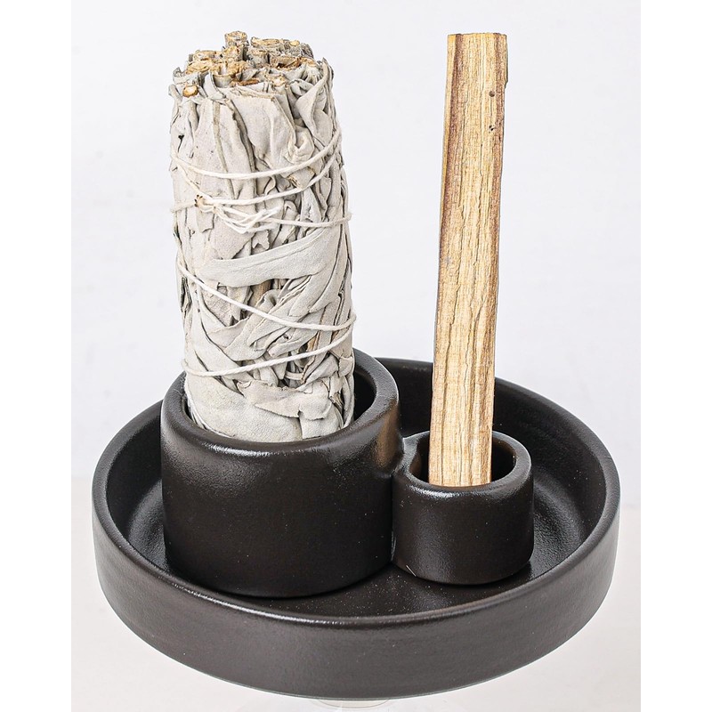 Ceramic Palo Santo and Sage Holder, Incense Holder for Palo Santo Sticks, Sage Burner Dish Stand with Ash Catcher, Modern Minimalist (Black)