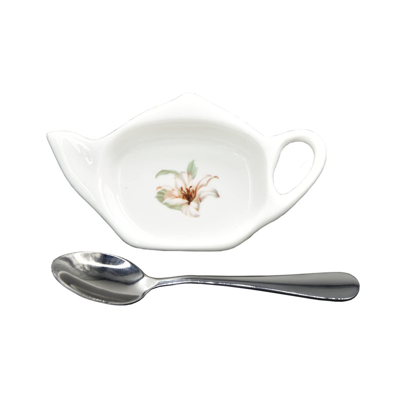 - Adorable Design. Ceramic teapot shaped tea bag caddy with printed flower design. This small resting plate saucer is a nice addition to your coffee tea bar