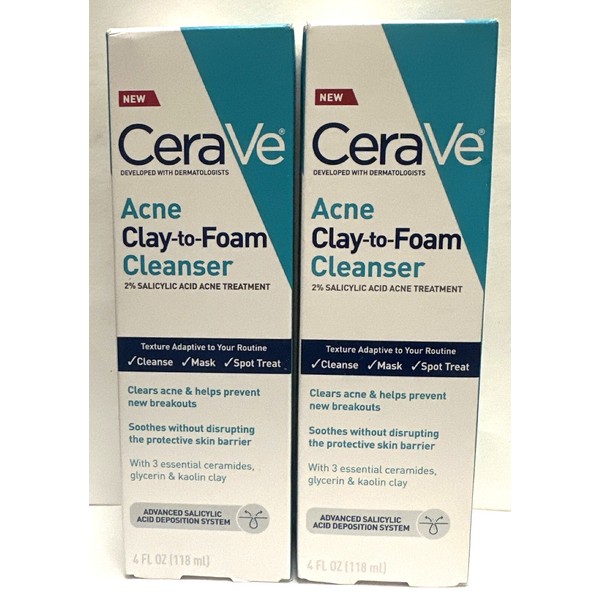 CeraVe Acne Clay-to-Foam Cleanser, 2 Packs(4 fl oz each) EXP:02/27 & UP