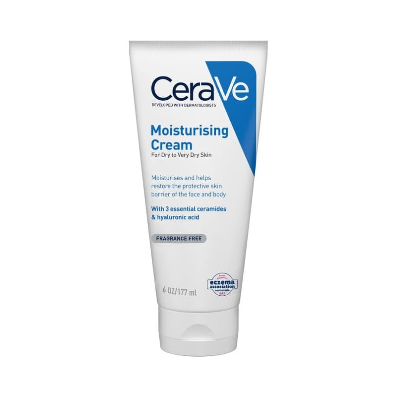 A rich moisturising cream for all day hydration with 3 essential ceramides to help strengthen the skin’s protective barrier. CeraVe Moisturising Cream both effectively hydrates and helps strengthen the skin’s protective barrier. Developed with dermatologists and ideal for dry to very dry skin on the face and body, this rich, non-greasy, fast-absorbing moisturising cream features patented MVE Technology to provide 24 hour hydration. Suitable for sensitive skin, this oil-free, paraben-free and fragrance-free cream also helps the skin hold on to moisture while improving its look and feel. Suitable for dry to very dry skin on the face and body MVE Technology: the Cerave range is designed with moisturising MultiVesicular Technology [MVE] to maintain hydration levels in the skin for 24 hours Ceramides: to maintain hydration and help strengthen the skin’s protective barrier Hyaluronic acid: This ingredient attracts hydration to the skin’s surface and helps the skin retain moisture Non-comedogenic, oil-free, hypoallergenic, fragrance-free and suitable for sensitive skin Developed with dermatologists Eczema Association Australia™ endorsed. The EAA stamp identifies products that are suitable for eczema prone skin.