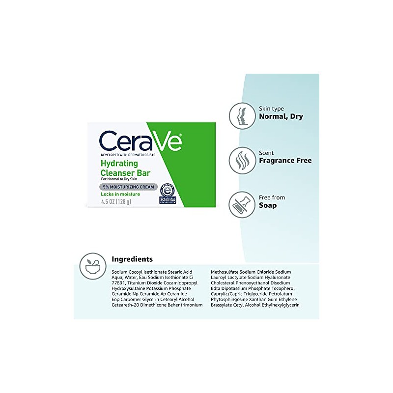 Developed with dermatologists, CeraVe Hydrating Cleanser Bar gently removes dirt, oil and makeup without disrupting skin's natural protective barrier. In addition to three essential ceramides and hyaluronic acid, this bar soap also features 5% CeraVe Moisturizing Cream and patented MVE Delivery Technology to release a steady stream of hydration throughout the day and night.
