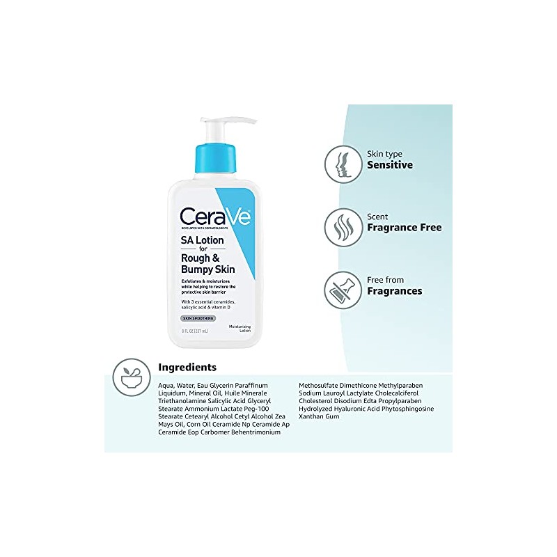 Developed with dermatologists, skin smoothing CeraVe Renewing SA Lotion has a unique lightweight formula that exfoliates and moisturizes while helping to restore the protective skin barrier. Salicylic acid exfoliates and softens to smooth rough skin, lactic acid exfoliates to renew skins surface and three essential ceramides (1, 3, 6-II) help to restore the protective skin barrier. Non-comedogenic Fragrance-free Hypoallergenic Gentle, non-irritating formula Key Ingredients: Salicylic Acid: Exfoliates for soft, smooth skin Vitamin D: Provides antioxidant protection MVE Technology: This patented delivery system continually releases moisturizing ingredients for 24-hour hydration Ceramides: Essential for healthy skin, ceramides help restore and maintain the skins natural barrier Hyaluronic acid: This ingredient attracts hydration to the skins surface and helps the skin retain moisture Niacinamide: Helps calm the skin