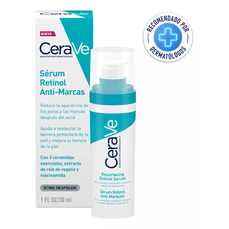El sérum Retinol Anti-Marcas de CeraVe es el primero de su tipo, diseñado para reducir la apariencia de los poros y las marcas post-imperfecciones. Este producto ayuda a restaurar la barrera protectora de la piel y mejora su textura.