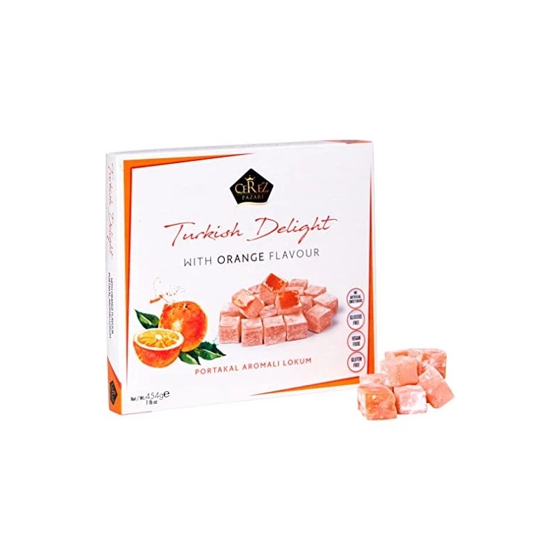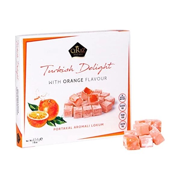 - DELICIOUS GOURMET TURKISH DELIGHT WITH PURE ORANGE FLAVOUR: Amazing orange taste Turkish Delight Lokum assortment treat which is soft, juicy, chewy and very fresh from the middle east. – Gluten & Dairy Free -Vegan & Halal Food -Pareve (Contains no meat or milk or its derivatives)-Made with original beet root sugar (No glucose syrup) -Great Snack mostly served near tea or coffee at home or office for your guests. This assortment is medium size & enough to feed at least 4 Turkish delight lovers.