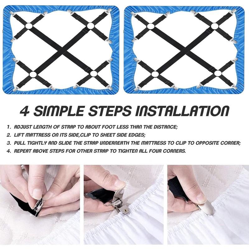 - 【Easy to Use and Install】Enjoy a wrinkle-free bed in just three simple steps: open the sheet clips, insert the sheet, and tighten or loosen using the buckle until the straps fit snugly around your mattress. Quick and hassle-free!