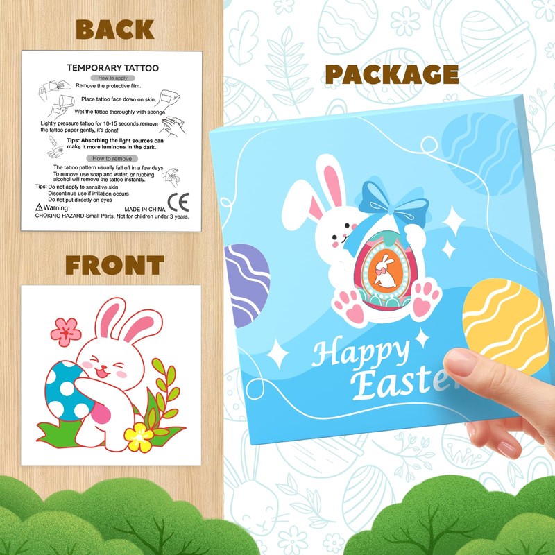 - 【408 pcs with Package】Cerlaza luminous Easter party supplies have 408 pcs in one pack. Easter easter games tattoos are individually packaged (No need to use scissors ), easy to carry, and can be distributed individually as prizes. 【Size】Each one is 1.6x1.6 inch (4x 4cm).